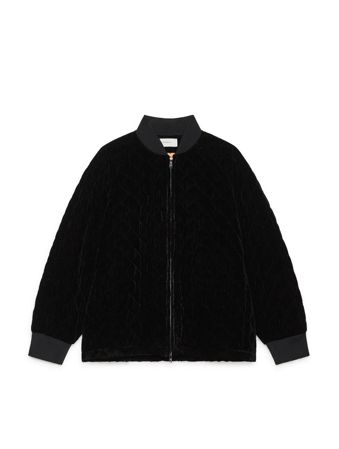 Il giaccone Sweet Velvet è l'ideale per le giornate più fredde. Realizzato in morbido velluto trapuntato, presenta una zip frontale e polsini in costina per un look bomber moderno. Il fondo regolabile con coulisse e la fodera interna con stampa a contrasto lo rendono comodo e pieno di carattere. Aggiungi un tocco di originalità al tuo guardaroba con questo capo unico e versatile 🖤