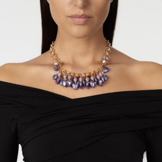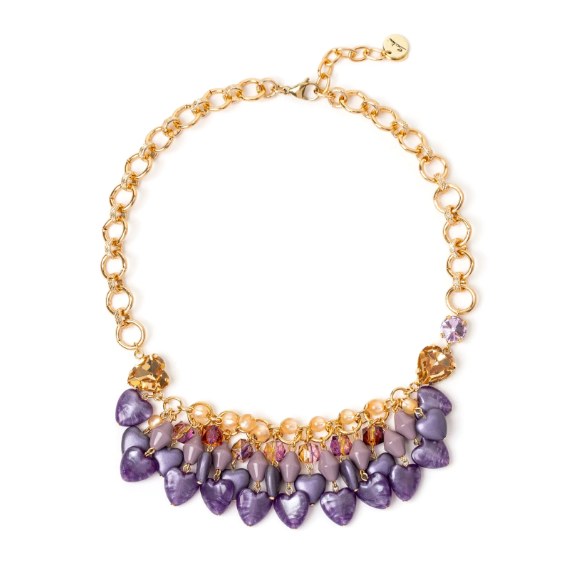 Girocollo Demetra: il tuo alleato di stile per ogni momento. Questo affascinante accessorio cattura l'attenzione con un design ipnotico e perfettamente equilibrato. La splendente catena centrale accoglie un delicato filo di mini boule accompagnato da ciondoli a forma di cuoricini in tonalità accattivanti. Disponibile nelle cromie beige, viola, fucsia e oro, si adatta a qualunque occasione e mood personale. Realizzato con cura e contraddistinto dalla targhetta Sodini sull'estensione, è l'accessorio che valorizza la tua unicità con eleganza e fascino.