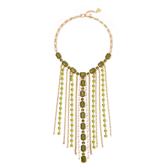 Regalati un tocco di eleganza con il girocollo Semira in verde olivina e oro. La catena splendente si unisce a un segmento di cristalli luminosi da cui scende una lunga frangia di catene e dettagli brillanti, esaltando il tuo decollete con raffinata luce. Questo gioiello raffinato è ideale per completare un look sofisticato o per aggiungere un dettaglio prezioso a ogni occasione. Una targhetta Sodini sull’estensione assicura autenticità e stile distintivo.