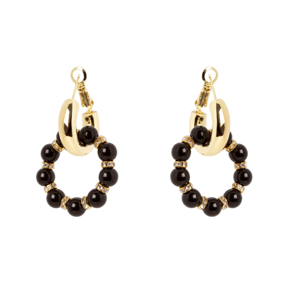 Gli orecchini a cerchio pendente Drusilla in nero uniscono eleganza e originalità, impreziosendo ogni outfit con un dettaglio raffinato. Il cerchietto aureo sostiene un pendente formato da piccole perle e mini anellini di strass che illuminano delicatamente il volto. Il contrasto di nero e oro conferisce un tocco sofisticato, mentre il logo Sodini sul retro garantisce autenticità. Perfetti per chi desidera distinguersi con stile in ogni occasione.