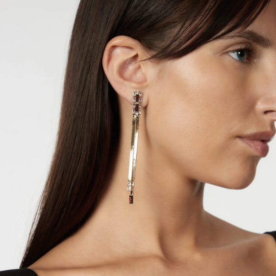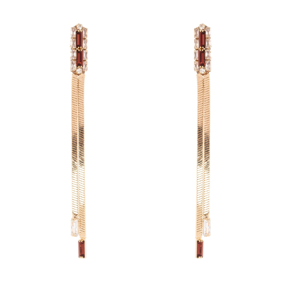 Gli orecchini lunghi Semira in tonalità rosso bordeaux e oro uniscono eleganza e stile contemporaneo. Il raffinato charm di cristalli scintillanti sostiene due catene serpentine che riflettono la luce, valorizzando il viso con un bagliore prezioso. Ideali per arricchire un outfit da occasione speciale o per aggiungere un tocco sofisticato ogni volta che desideri. Sul retro, il logo Sodini garantisce autenticità e qualità. Un accessorio versatile che ti fa sentire unica e luminosa in ogni momento.