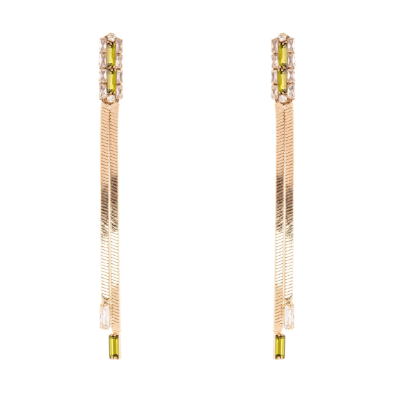 Questi eleganti orecchini lunghi Semira in tonalità verde olivina e oro sono perfetti per aggiungere un tocco di luce e raffinatezza al tuo look. Il design presenta un charm brillante di cristalli che sostiene due delicate catene serpentine, capaci di illuminare il viso con un gioco di riflessi sofisticati. Ideali per occasioni speciali o per un tocco di eleganza quotidiana, questi orecchini uniscono stile e qualità con il logo Sodini posto discretamente sul retro. Un accessorio che valorizza ogni momento con classe.