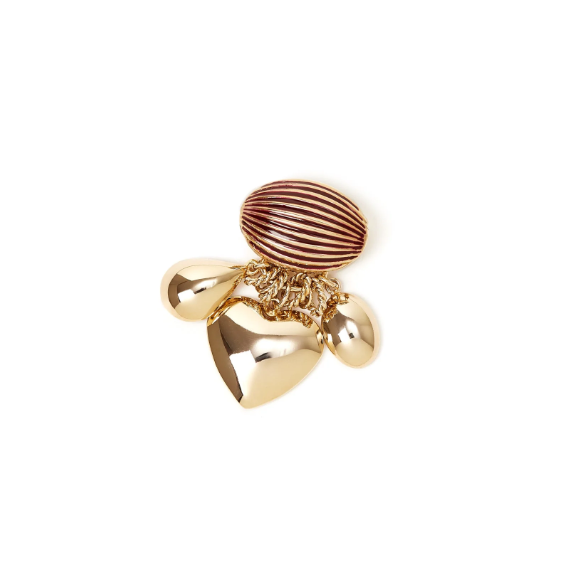 Questa spilla ovale Malena in raffinato rosso bordeaux con dettagli dorati dona eleganza e movimento a ogni outfit. Il design con linee scanalate incornicia un ovale lucente da cui pendono tre delicati ciondoli, incluso un cuore scintillante che cattura lo sguardo. Perfetta per arricchire qualsiasi occasione con un tocco di classe discreta, è completata dal logo Sodini sul retro per un dettaglio autentico e prezioso.